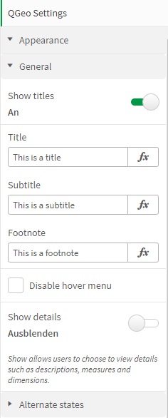 Within the “Appearance” panel general extension settings (e.g. to set title, set undertitle, set footnote) can be configured.