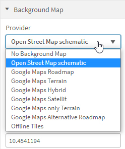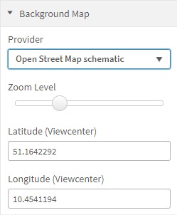 Within the “Background Map” panel different background map provider can be choosen. Additionally the zoom level and the center of the map view (as latitude, longitude) can be set. By default “Open Street Map schematic” is selected as background map provider.