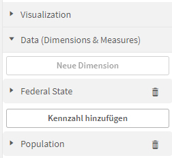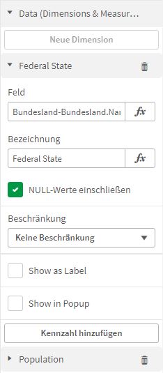 Within the “Data” panel the dimension and measures of the extension can be configured. QGeo allows to configure one dimension and multiple measures (to to 24). The selected dimension is used as identifier and needs to match with the selected identifier of the geodata. Within the panel of a dimension and measure the user can configure if to show in popup and/or show as label on the map.