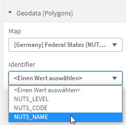 The map [Germany] Federal Stats (NUTS1) for example contains three possible identifier NUTS_LEVEL, NUTS_CODE and NUTS_NAME where the identifier “NUTS_NAME” represents the name of the federal state (e.g. Sachsen).
