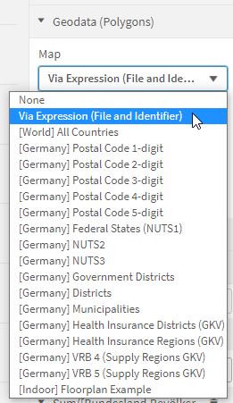 Each map file contains at least one identifier which also must be selected. Values of the selected identifier must match the dimension values to visualize and color polygons according to a selected kpi/measure. There are different options to select a map file and an identifier.