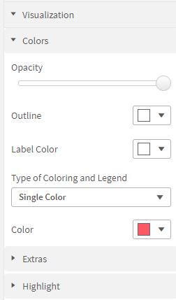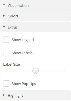 The “Visualization” panel contains the “Colors”, the “Extras” and the “Highlight” panels to configure the visualization of the data and extra map features as popups, labels and highlighting.
